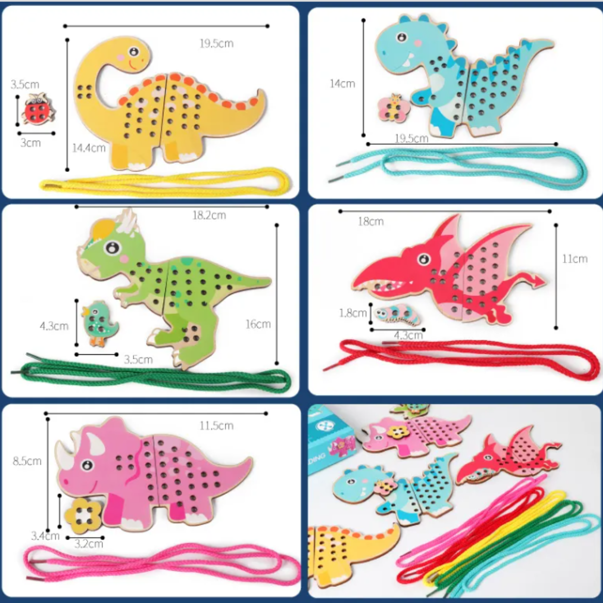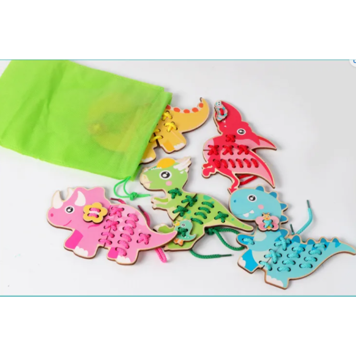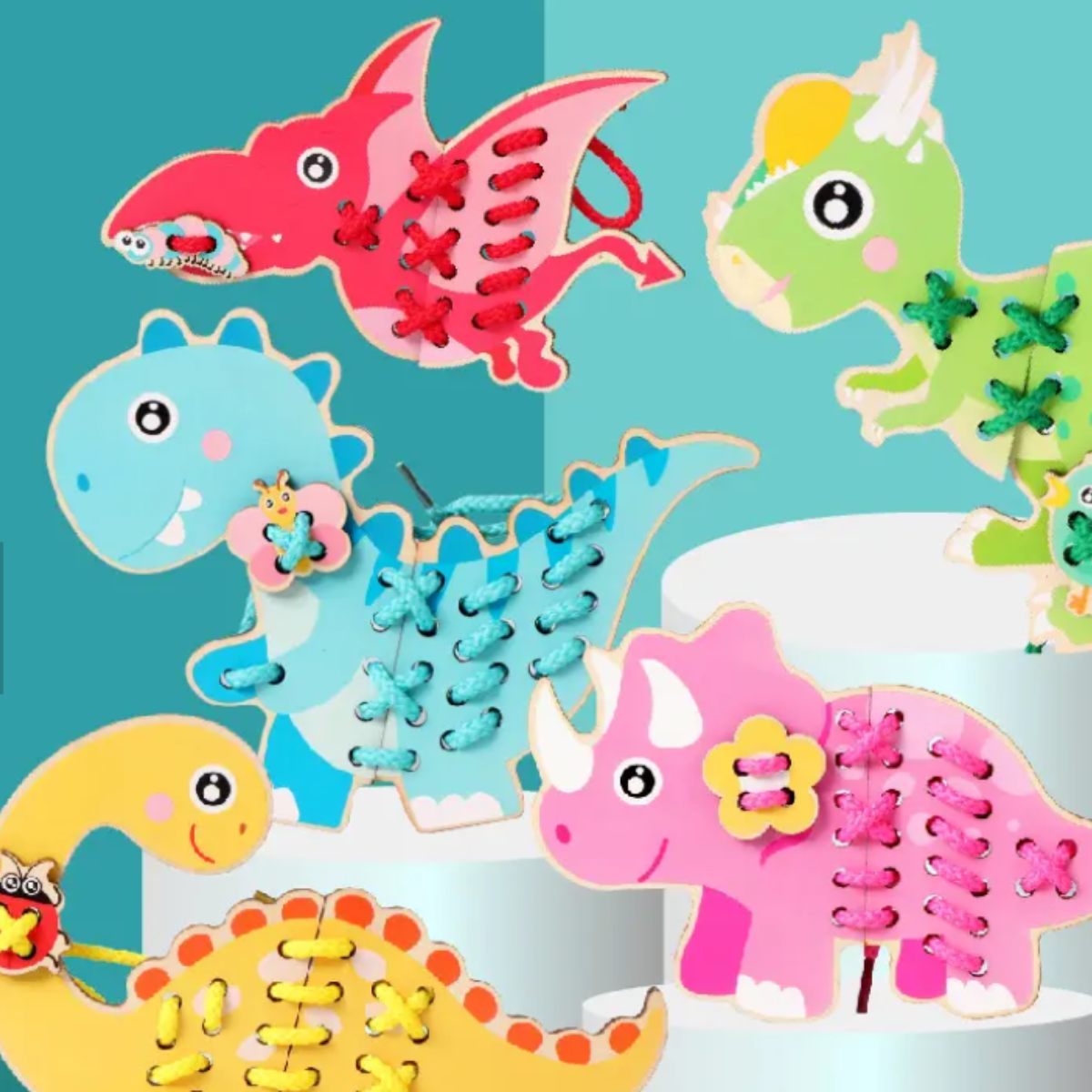 Juego de placas de dinosaurios Montessori para enlazar con agujetas